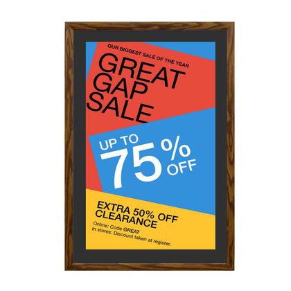 Cost effective, wall mount wood snap frames for small and large signage projects are accentuated with a simulated wood wrap finish and are the ideal choice for many quick change display applications that require an interior touch with a wood finish.