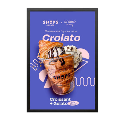• Quick-Changing, all 4 frame rails snap-open for easy poster changes