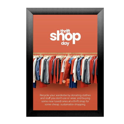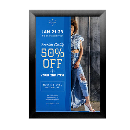 Aluminum Snap Frames 60x84 are the most popular changeable poster displays. Simplicity and low cost are the primary reason as well as offering the most popular 60 x 84 poster frame finishes, black, silver and gold that fit comfortably within numerous interior retail store decors. One 60 x 84 poster display or several 60x84 sign frames or thousands of 60x84 frames, “poster snaps” remains the favored choice for small and large businesses, retail stores, corporations, institutions and as a POP display signage fixture. Wall mount and snap open your 60x84 snap frame, update your 60 x 84 poster, and snap shut. That's it!