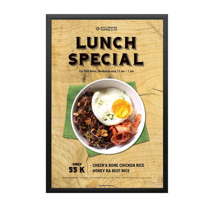 Whatever the application, these oversized, mitered, high quality, front-loading "SwingSnap" wood poster display frames make a popular poster display and sign holder, widely used for trade shows, exhibits, banks, and as store signage fixtures.