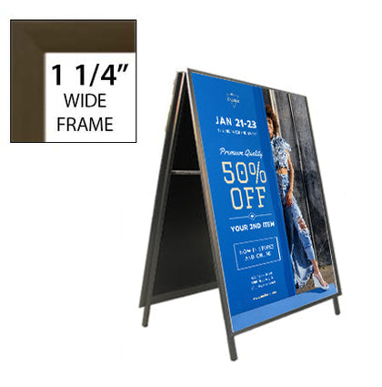 AFrame display stand finishes come in either in Black or Silver. To compliment wide-ranging interior decors, choose from 8 colorful snap frame finishes. Portable and easy to store, the 20" x 28" A Frame Floor Sign Holder Stand easily folds to place onto your desired floor location.