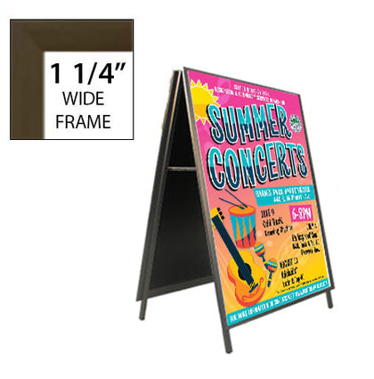 Extra Large AFrame display stand finishes come in either in Black or Silver. To compliment wide-ranging interior decors, choose from 8 colorful snap frame finishes. Portable and easy to store, the 27" x 39" A Frame Floor Sign Holder Stand easily folds to place onto your desired floor location.