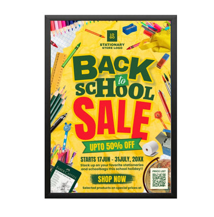 - Quick-Changing, all 4 frame rails snap-open for easy poster changes